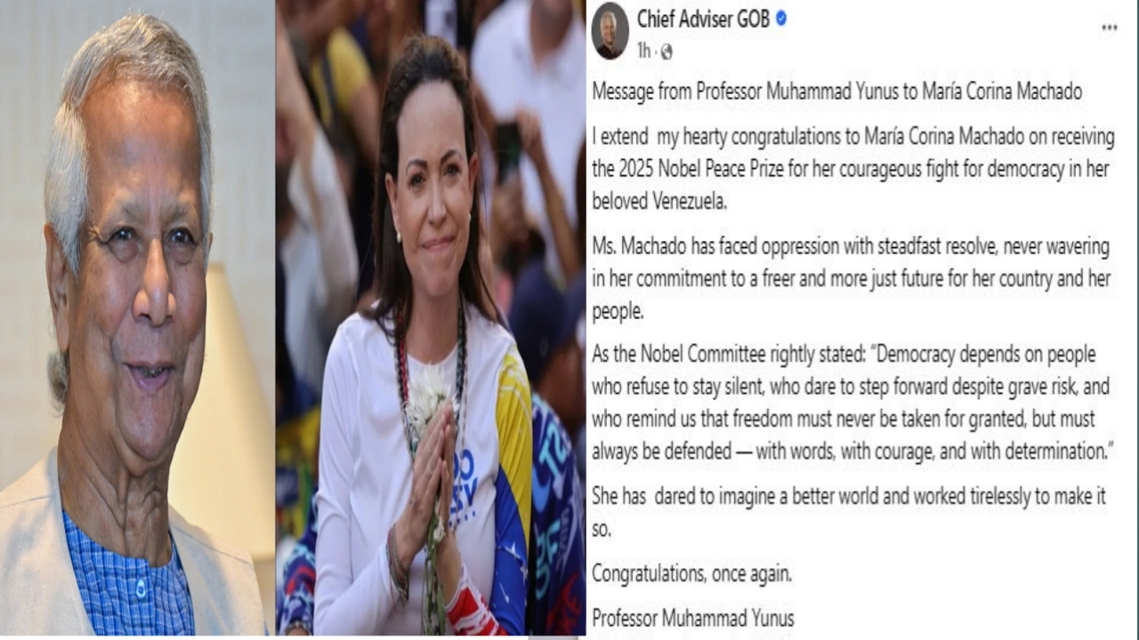 ঢাকা: ২০২৫ সালের নোবেল শান্তি পুরস্কার অর্জনের জন্য ভেনেজুয়েলার বিরোধীদলীয় নেতা মারিয়া কোরিনা মাচাদোকে অভিনন্দন জানিয়েছেন প্রধান উপদেষ্টা অধ্যাপক মুহাম্মদ ইউনূস।ভেনেজুয়েলায় গণতন্ত্র প্রতিষ্ঠার জন্য মাচাদোর সাহসী লড়াইকে বিশেষভাবে প্রশংসা করেছেন ড. ইউনূস।প্রধান উপদেষ্টার বার্তায় উল্লেখ করা হয়, মাচাদো দমন-পীড়নের মুখে অটল থেকে তার দেশের ও জনগণের জন্য একটি স্বাধীন ও ন্যায়সঙ্গত ভবিষ্যতের প্রতিশ্রুতিতে কখনোই পিছপা হননি।পোস্টে আরও বলা হয়, নোবেল কমিটি যথার্থভাবেই বলেছে, ‘গণতন্ত্র টিকে থাকে সেইসব মানুষের ওপর—যারা চুপ থাকেন না, যারা গুরুতর ঝুঁকির মাঝেও সাহস করে সামনে আসেন এবং যারা আমাদের মনে করিয়ে দেন যে স্বাধীনতা কোনো দিনই নিশ্চিত কিছু নয়। এটি সবসময় রক্ষা করতে হয়—কথা দিয়ে, সাহস দিয়ে, এবং অদম্য সংকল্প দিয়ে।’