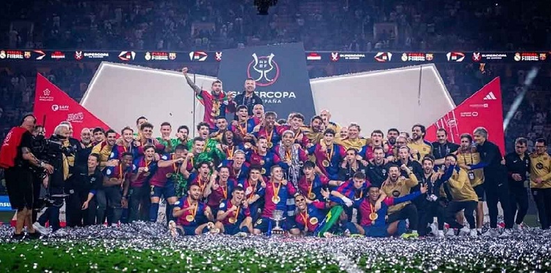 স্পোর্টস ডেস্ক: সৌদি আরবে অনুষ্ঠিত স্প্যানিশ সুপার কাপের সেমিফাইনালে টুর্নামেন্টের ইতিহাসে এক ম্যাচে সর্বোচ্চ ব্যবধানের জয়ে ফাইনালে উঠে গেছে বার্সেলোনা। গতকাল বুধবার (৭ জানুয়ারি) দিবাগত রাতে আর্নেস্তো ভালভার্দের কোচিংয়ে থাকা অ্যাথলেটিক বিলবাওকে ৫–০ গোলে উড়িয়ে দেয় কাতালানরা। এই দাপুটে জয়ে শিরোপা ধরে রাখার লক্ষ্যে শক্ত বার্তা দিয়েছে হ্যান্সি ফ্লিকের শিষ্যরা। ম্যাচে বার্সেলোনার হয়ে গোল করেন ফেরান তোরেস, ফেরমিন লোপেজ ও রুনি বার্ডঘজি; জোড়া গোল আসে রাফিনহার পা থেকে। আক্রমণভাগের গতি, নিখুঁত পজিশনাল ফুটবল ও ধারাবাহিক চাপের মাধ্যমে পুরো ম্যাচজুড়েই অ্যাথলেটিক বিলবাওকে কোণঠাসা করে রাখে বার্সেলোনা। পরিসংখ্যানেও ম্যাচটি হয়ে ওঠে বিশেষ স্মরণীয়। অপ্টার তথ্য অনুযায়ী, স্প্যানিশ সুপার কাপের ইতিহাসে এর আগে কখনো এক ম্যাচে এত বড় ব্যবধানে জয় পায়নি কোনো দল। একই সঙ্গে ২০১০–১১ মৌসুমের পর এই প্রথম কোনো সুপার কাপ ম্যাচে তিনজন ভিন্ন খেলোয়াড় প্রত্যেকে তিনটি করে গোলে সরাসরি অবদান রাখলেন। ফেরমিন লোপেজ একটি গোলের পাশাপাশি দুটি অ্যাসিস্ট করেন, রাফিনহা দুই গোল ও একটি অ্যাসিস্টে ম্যাচে বড় ভূমিকা রাখেন, আর রুনি বার্ডঘজি একটি গোলের সঙ্গে দুটি অ্যাসিস্ট যোগ করেন। এই জয়ের মাধ্যমে সুপার কাপের ফাইনালের টিকিট নিশ্চিত করেছে বার্সেলোনা। রোববার শিরোপা নির্ধারণী ম্যাচে তাদের প্রতিপক্ষ হবে রিয়াল মাদ্রিদ অথবা অ্যাতলেতিকো মাদ্রিদ। ফাইনালে ওঠার সুযোগ পেতে আজ রাতে সেমিফাইনালে মুখোমুখি হবে মাদ্রিদের দুই চিরপ্রতিদ্বন্দ্বী।